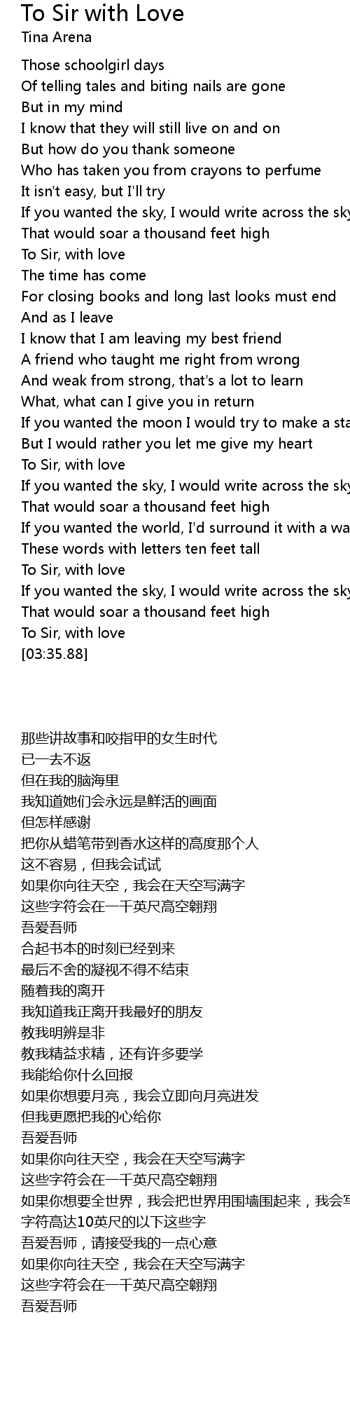 To Sir With Love - Lulu (Lyrics), These are the lyrics to an oldiie but goody love song by Lulu. . We Have got 9 picture about To Sir With Love Song Lyrics images, photos, pictures, backgrounds, and more. In such page, we additionally have number of images out there. Such as png, jpg, animated gifs, pic art, symbol, blackandwhite, pics, etc. "Lulu TO SIR WITH LOVE lyrics letra Al maestro con cari\u00f1o", TO SIR WITH LOVE Lulú with lyrics letra Al maestro con cariño 1967 Tema central de la película "Al maestro con cariño" de 1967 . "Glee: To Sir With Love Lyrics", Hello all!!! Here is another lyric video. I mixed this one up with backgrounds and I tried to match the background to the lyrics of the ..
